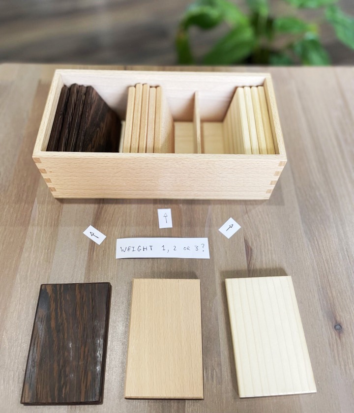 Using Baric Tablets and other materials, children learn to feel and compare different weights, developing their sense of mass and measurement.