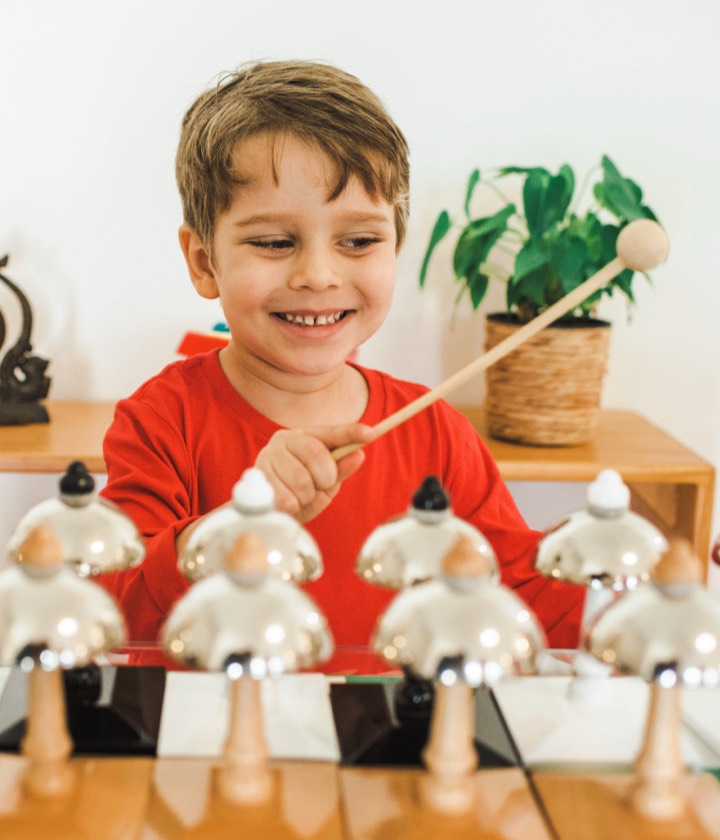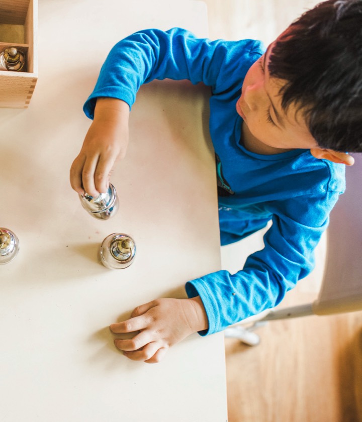 Using materials like Sound Cylinders, children learn to match and grade different tones and sounds, developing their musical ear and listening skills.